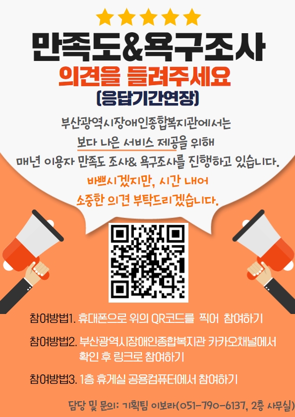부산광역시장애인종합복지관에서 2021년 복지관 만족도 및 욕구조사를 진행하여 안내드립니다.